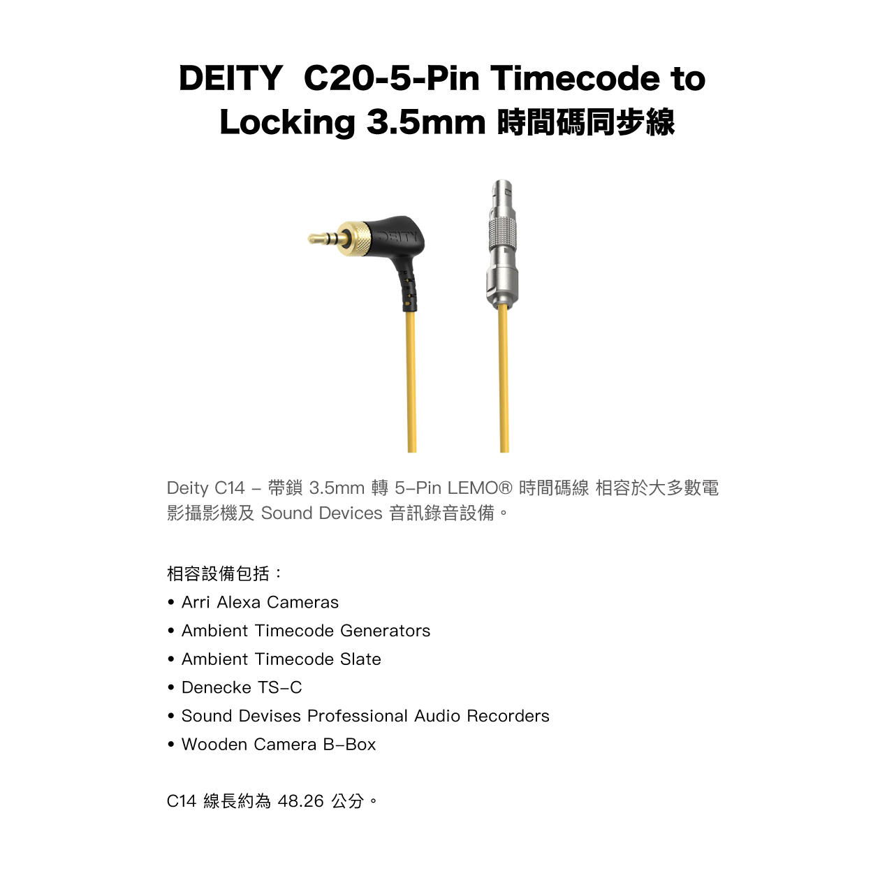 DEITY C14 是一條專為專業影視拍攝設計的時間碼同步線,一端為帶鎖的 3.5mm TRS 插頭,另一端為標準 5-Pin LEMO(直式)接頭。此線可將時間碼從像是 Deity TC-1 時間碼發射器 傳輸到支援 5-pin LEMO 輸入的攝影機或錄音設備。